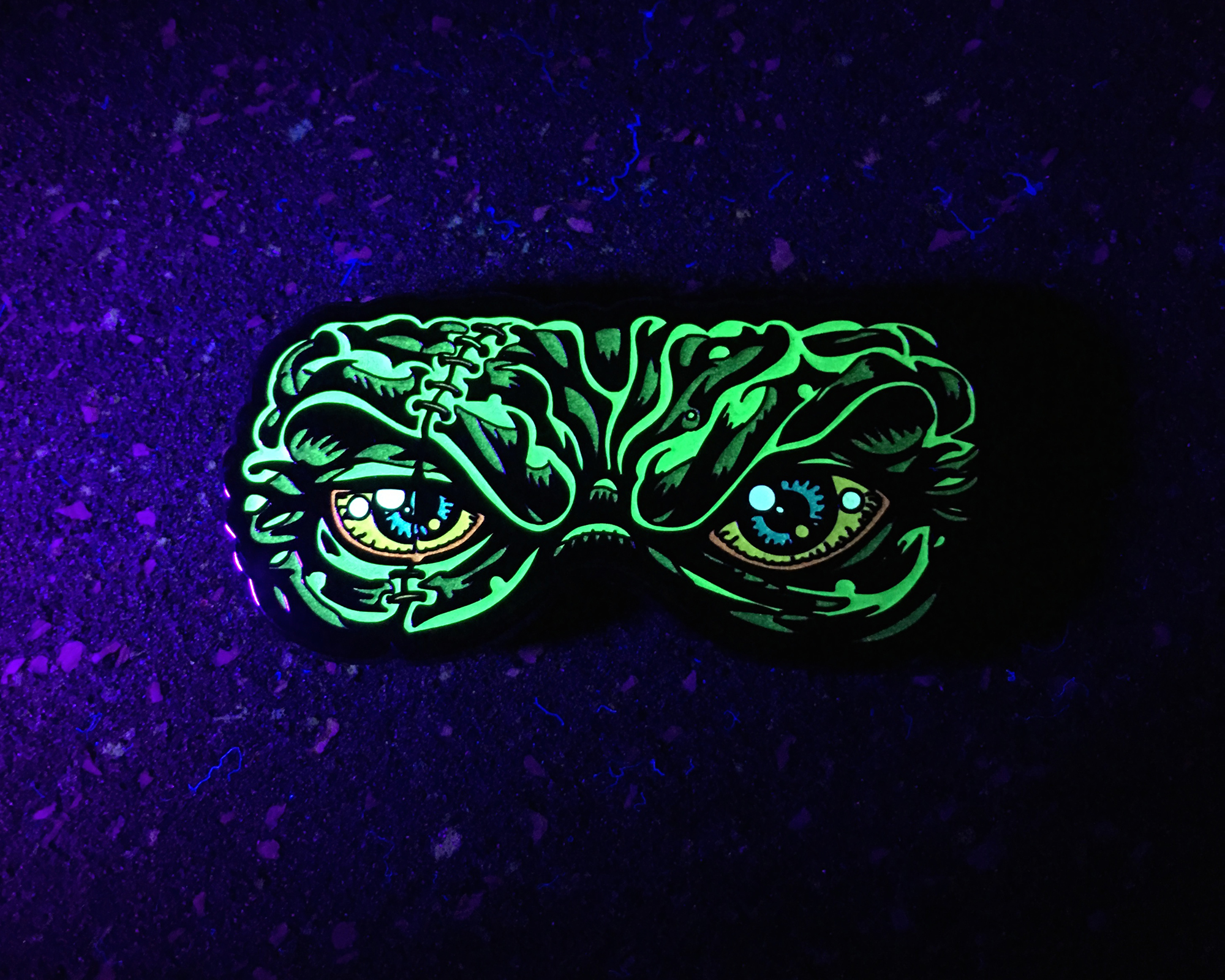 Approximately 1.75 inches wide, Material: iron Process: Soft enamel, – uv reactive 1.75″ wide – Double posted with yellow rubber backs. Back stamped with Jimbo Phillips’ signature and the ODRD logo
