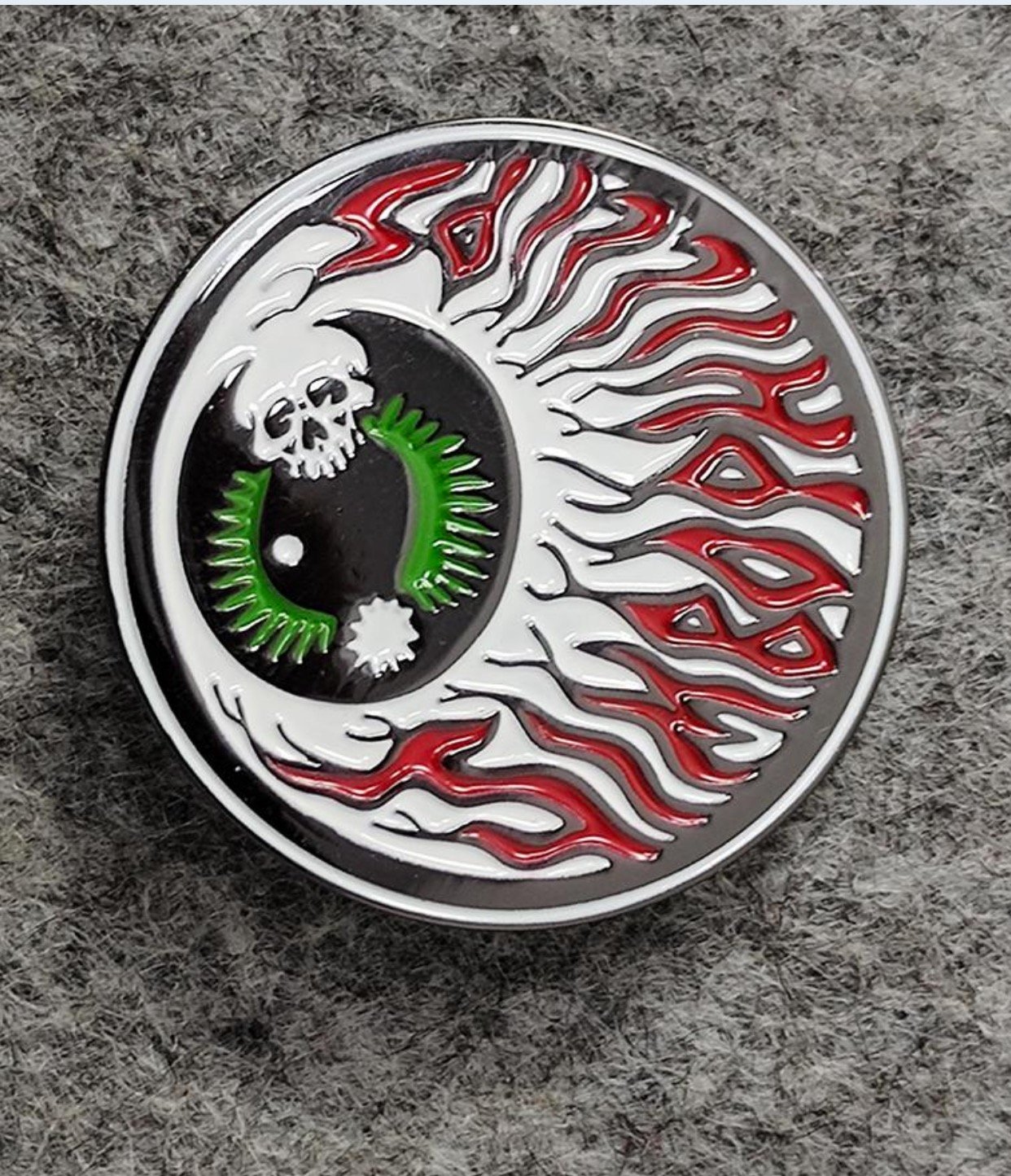 Approximately 1.25 X 1.25 inches long, Material: iron Process: soft enamel, Plating:metal, Attachment: rubber clutch Designed by Jimbo Phillips
