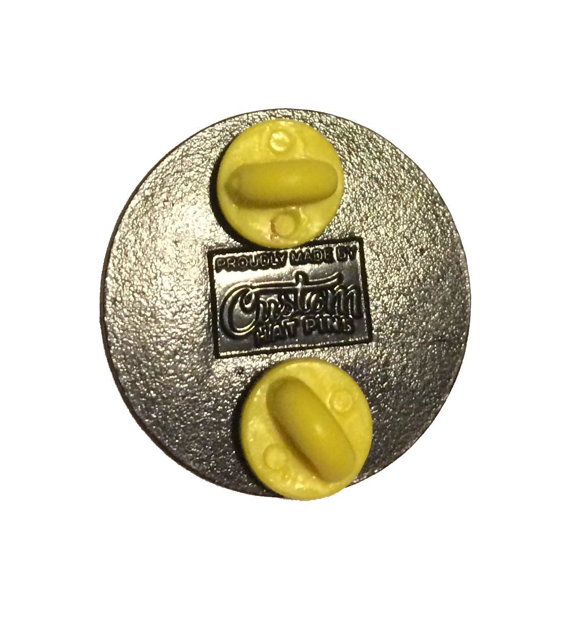 Approximately 1.25 inch by 1.25 inches long, Material: iron Process: soft enamel, Plating:metal, Attachment: double yellow rubber clutch Designed by Jimbo Phillips