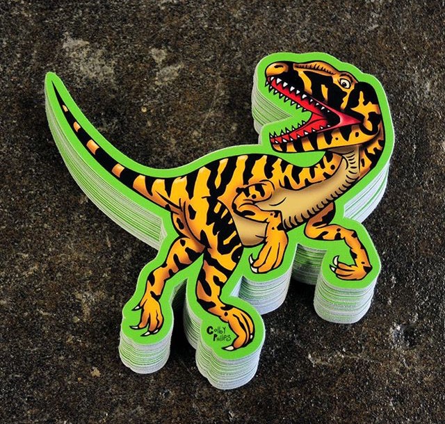 Full color shaped vinyl V-Raptor sticker with artwork created by COLBY PHILLIPS son of legendary extreme sports artist Jimbo Phillips, Jimbo is famous for his incredibly extensive line of graphics spanning from Santa Cruz Skateboards, Bell Helmets, Volcom and so much more. This full color artist sticker is approx. 5"x5" and a must have! thanks for viewing!