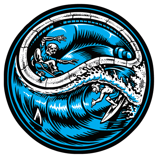 High quality full color shaped vinyl Surf Skate sticker with artwork created by Jimbo Phillips, This full color artist sticker is 3.5" X 3.5" and a must have! thanks for viewing!