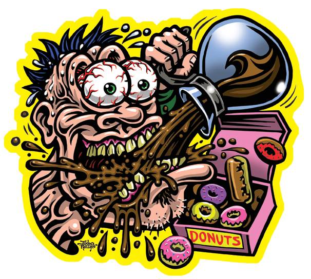 High quality full color shaped vinyl Coffee Fiend sticker with artwork created by Jimbo Phillips, This full color artist sticker is 4" X 3" and a must have! thanks for viewing!