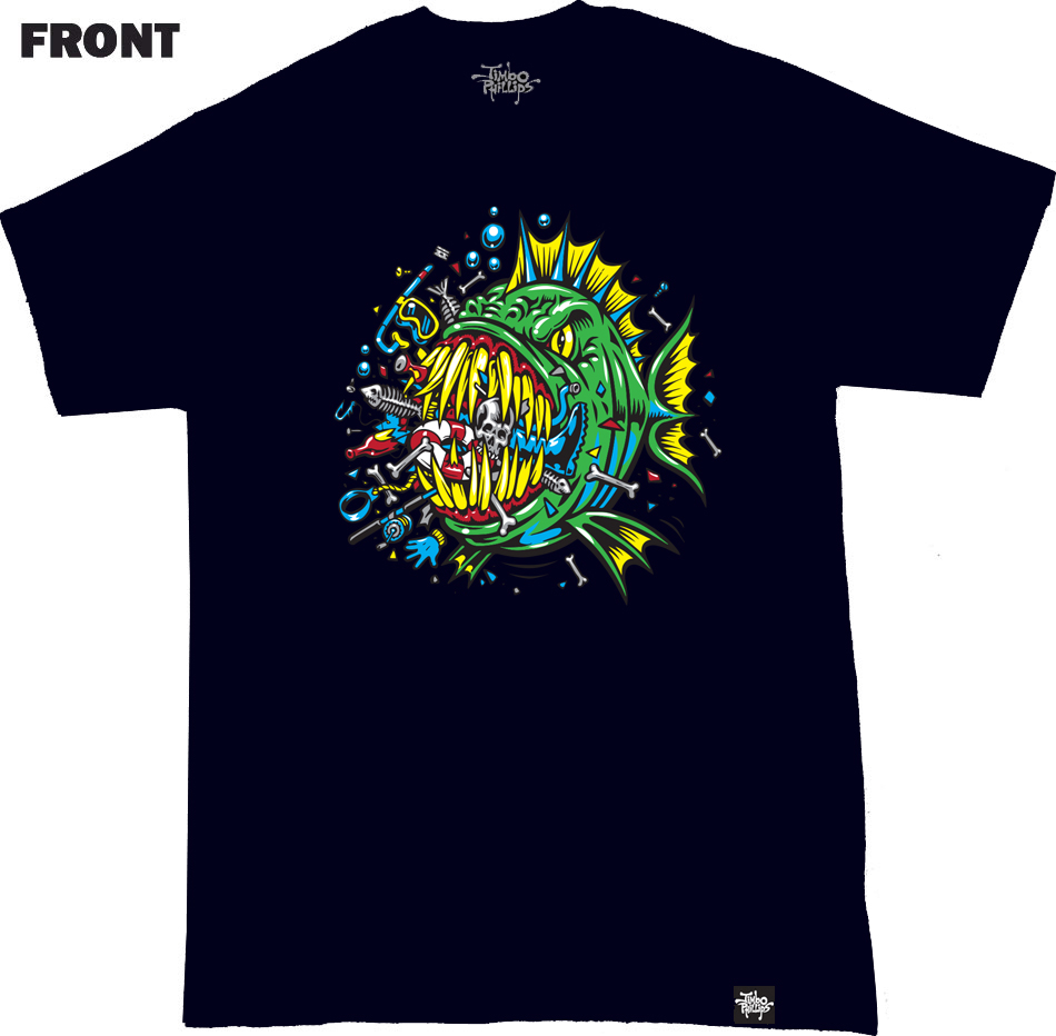 "Bad Fish" adult sized screen printed premium tagless Tshirt, this is an official shirt from the Jimbo Phillips Graphix studios with artwork completely created by Jimbo Phillips, this shirt is 100% cotton and comes in Dark Blue, Only available here at the official Jimbo Phillips webstore! View the images provided for a glimpse at the front and back.