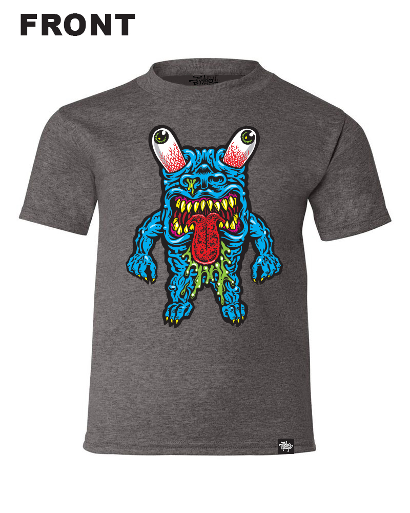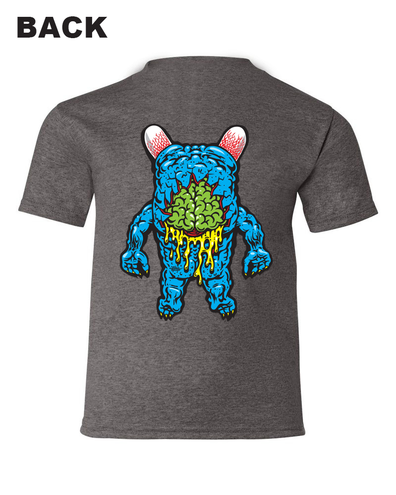 "KARL" adult sized screen printed premium Tshirt, this is an official shirt from the Jimbo Phillips Graphix studios with artwork completely created by Jimbo Phillips, this shirt is 100% cotton and comes in Dark Heather grey, Only available here at the official Jimbo Phillips webstore! View the images provided for a glimpse at the front and back.