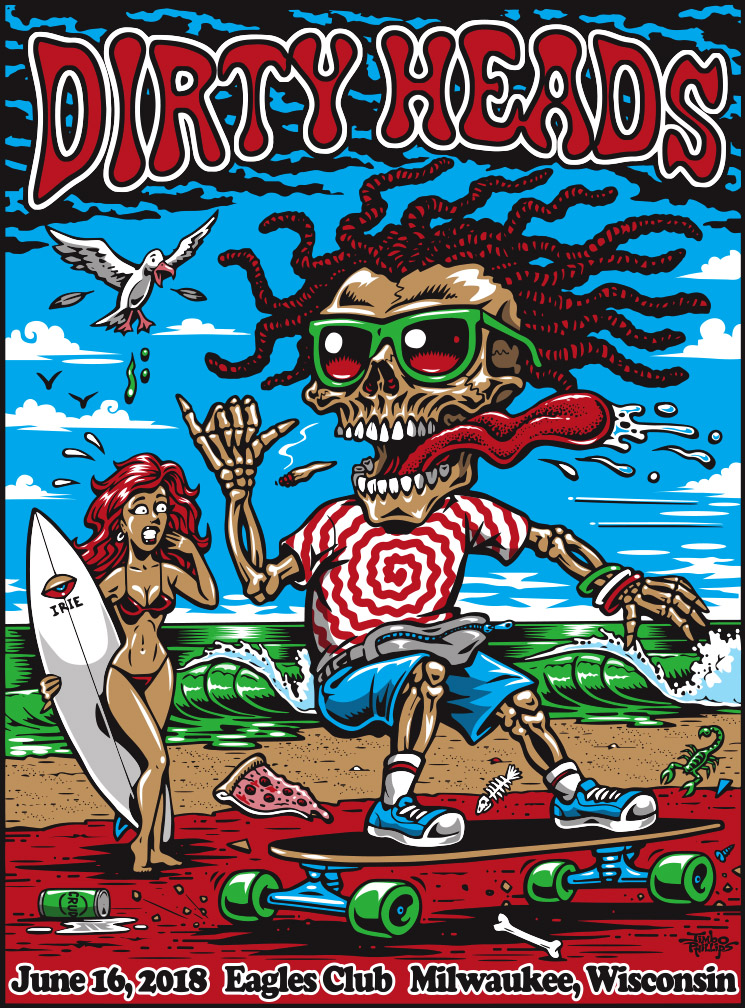5 color screenprinted Dirty Heads poster with artwork created by Jimbo Phillips, This limited edition (125) signed and numbered by the artist poster is approx. 18"x24" and in new condition. It was made for their summer concert in Milwaukee, WI. A must have! (item will be carefully shipped) thanks for viewing!