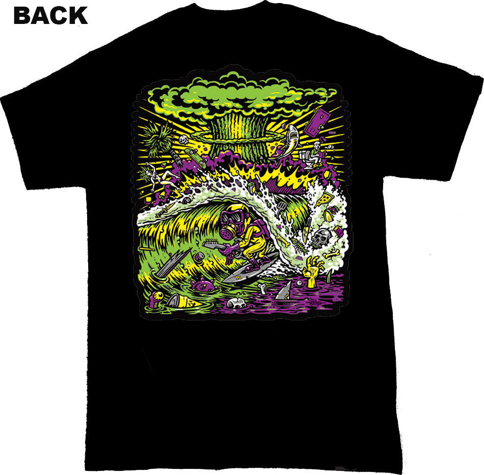 "Toxic Surfer" adult sized screen printed premium tagless T-shirt, this shirt is 100% cotton and comes in Black, Only available here at the official Jimbo Phillips webstore! View the images provided for a glimpse at the front and back.
