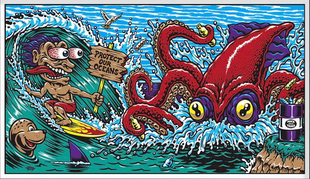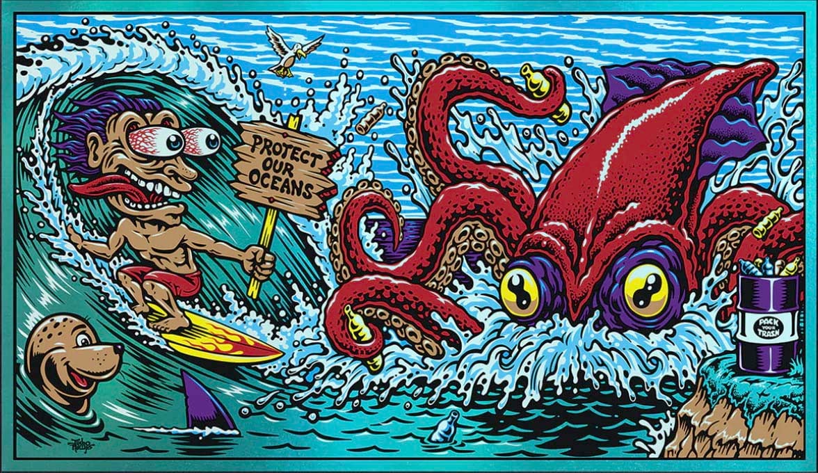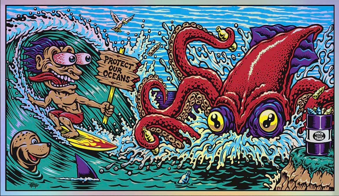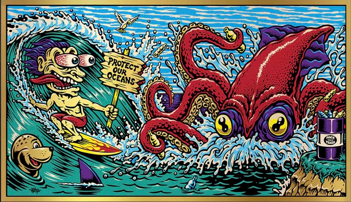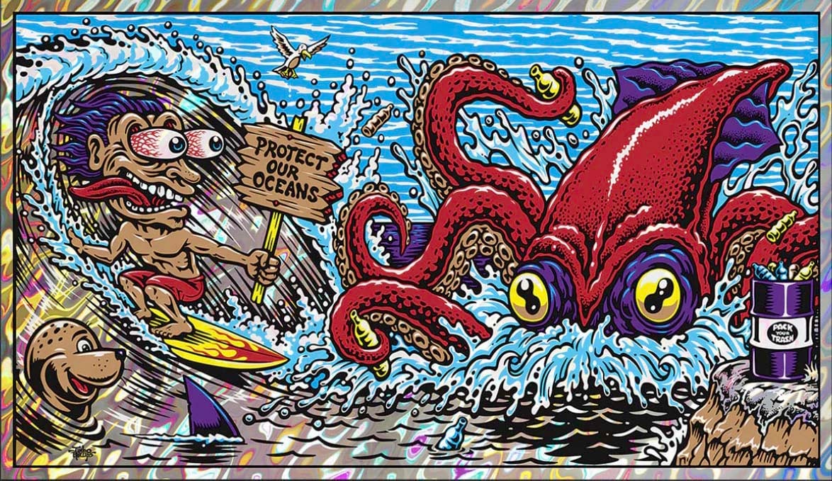 Full color screenprinted Foil "Protect Our Oceans" poster for the Pangea seed 2019 Mural tour, This super limited edition signed by the artist poster is approx. 12"x 24" and in new condition. A must have! (item will be carefully shipped) thanks for viewing!