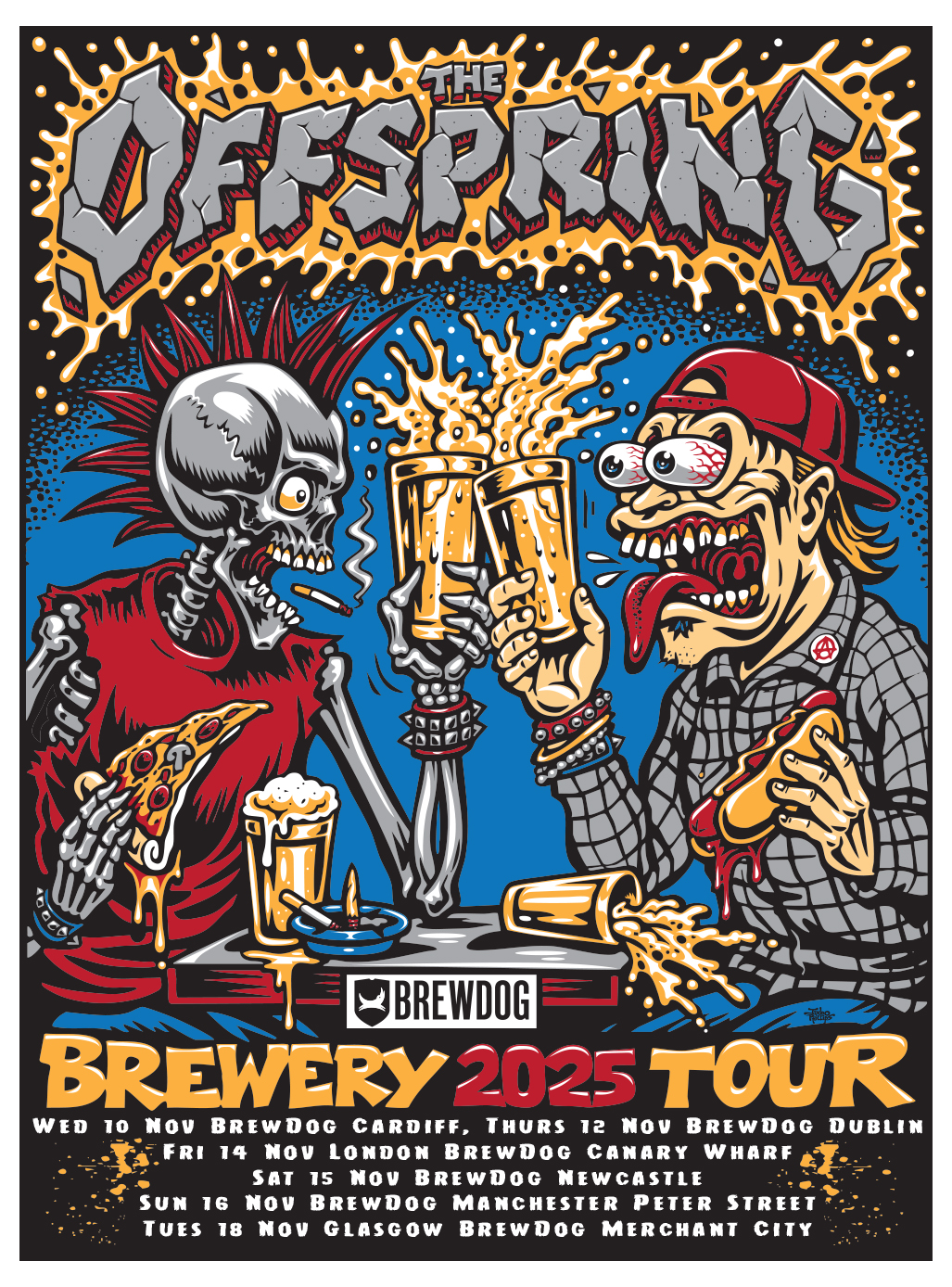 Full color screenprinted The Offspring 2025 Brewery Tour poster, artwork created by Jimbo Phillips for their Brewdog Tour in 2025, This limited edition (AP 50) signed and numbered by the artist poster is approx. 18"x24" and in new condition. A must have! (item will be carefully shipped) thanks for viewing!