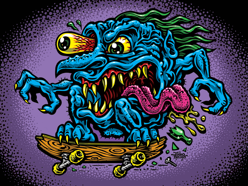 Super vibrant, collectible and signed by the artist full color 18" x 24" SKATE CREEP poster, printed on quality matte finish card stock with giclée fade resistant ink, art created by legendary extreme sports artist Jimbo Phillips, famous for his incredibly extensive line of graphics spanning from Santa Cruz Skateboards, Bell Helmets, Volcom and so much more. Item will be carefully shipped rolled never folded, thanks for viewing!